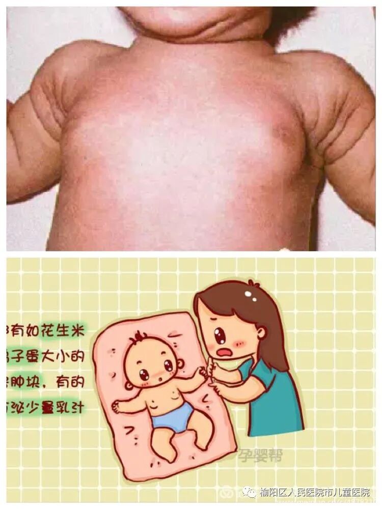 部分新生儿出生后由于受到母亲体内雌激素的影响,乳腺增大如蚕豆或核桃大小,一些婴儿甚至可以挤出少许乳汁,家长不必担心,不需特殊处理,2~3 周可自然消退,但切忌挤压,以免发生感染。